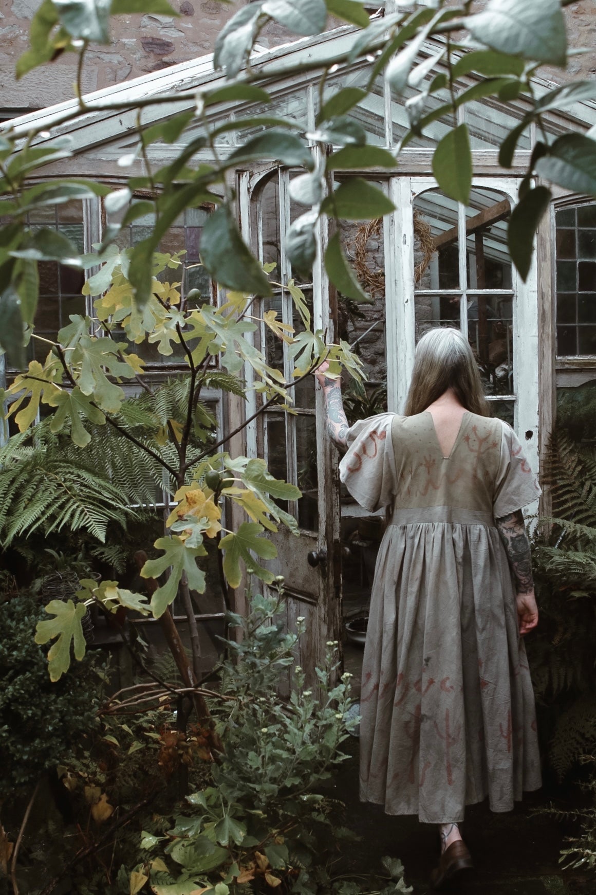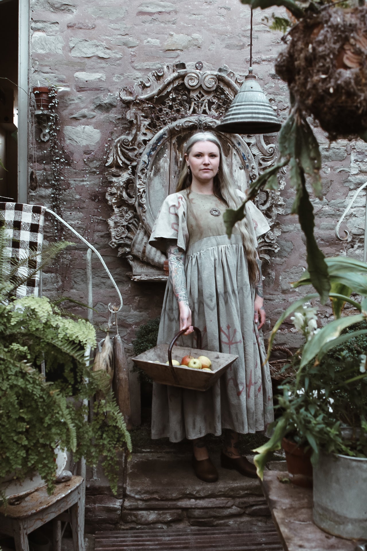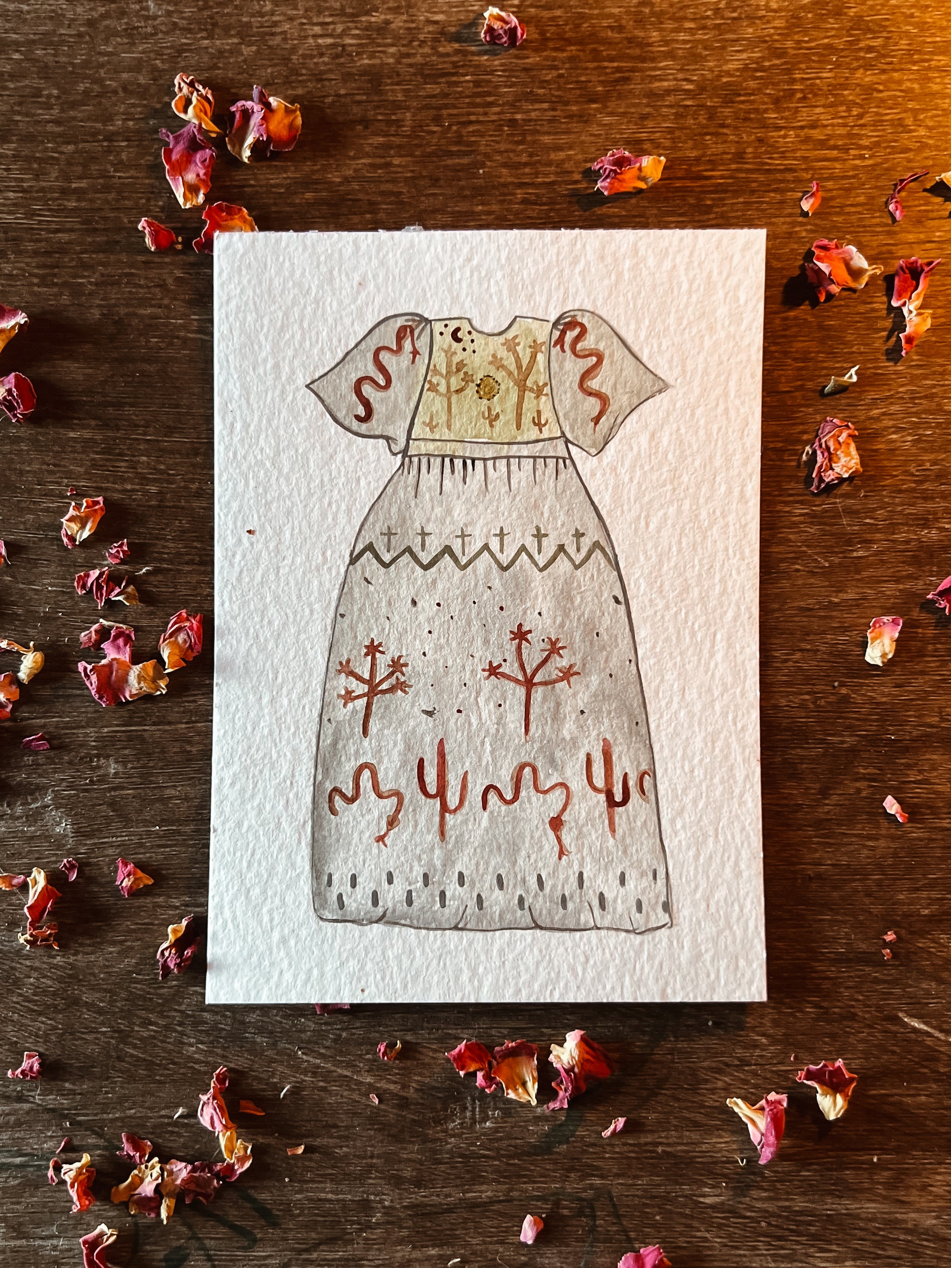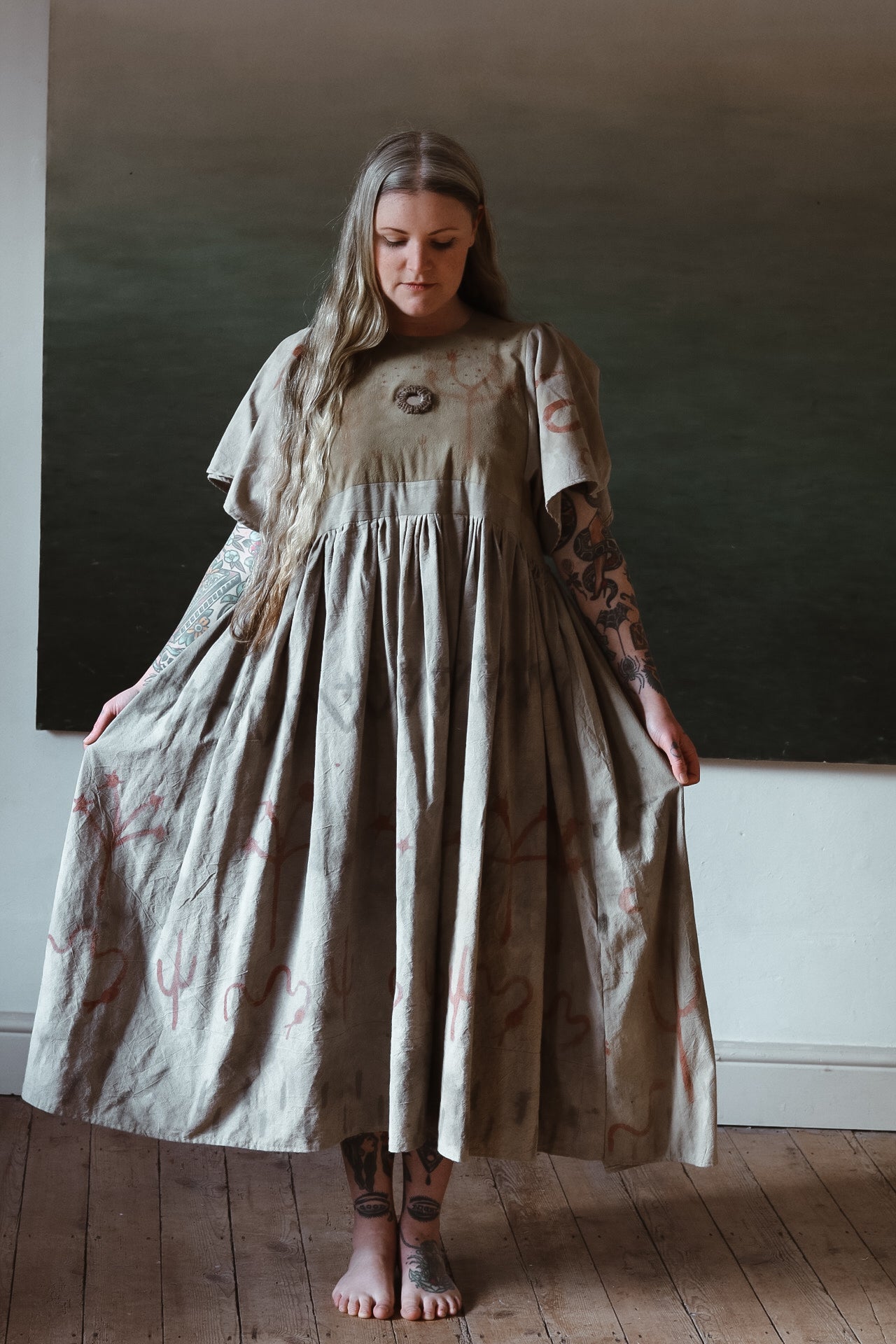 A one of a kind Devotional Habit, hand made & naturally dyed with hawthorn blossom, onion skins & sorrel. Hand painted with home made botanical paints made from madder root, turmeric & tea leaves.