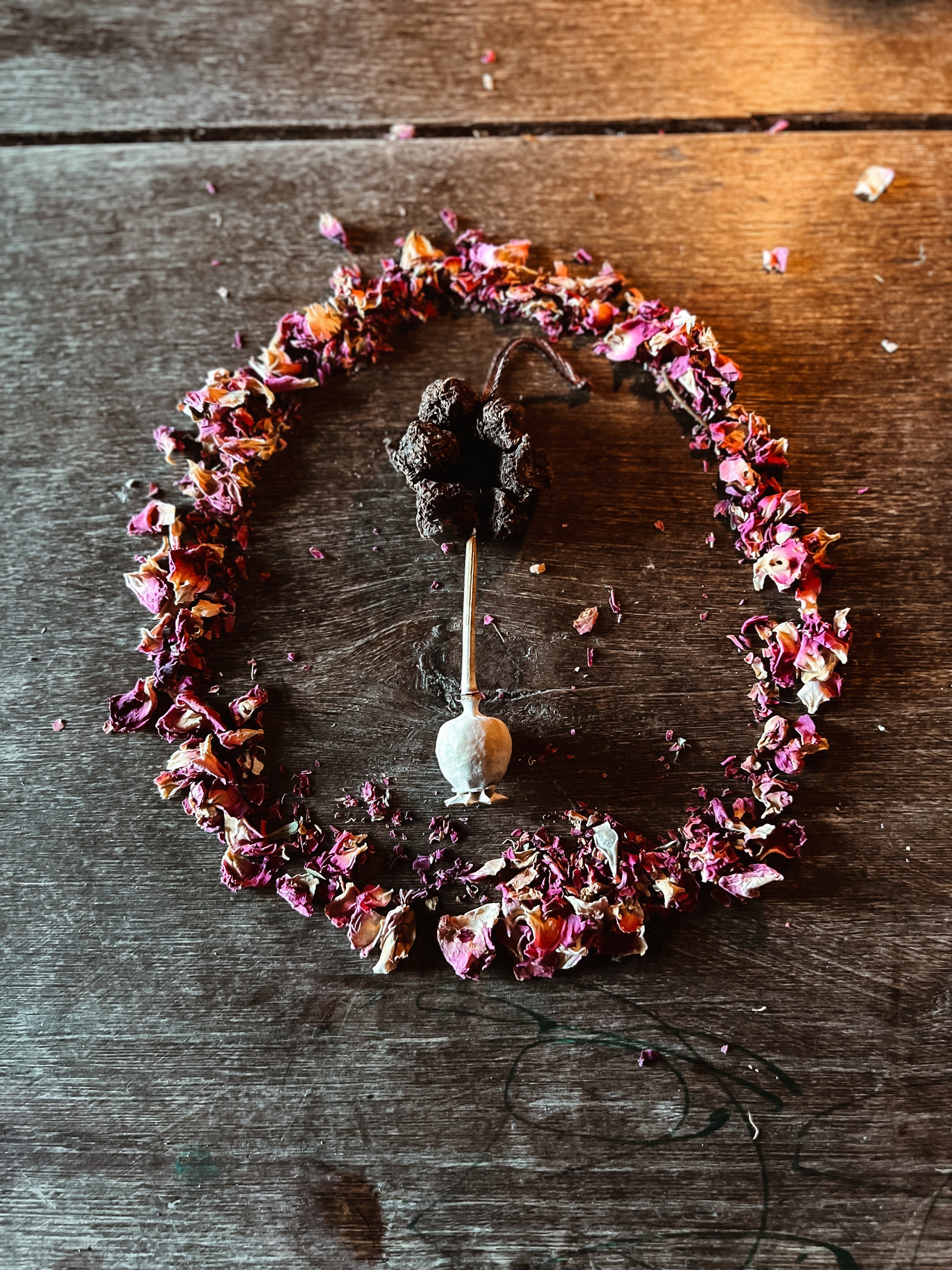 Each habit comes with a hand painted candle to accompany the ritual & rosary bead talisman made from rose petals for your altar.